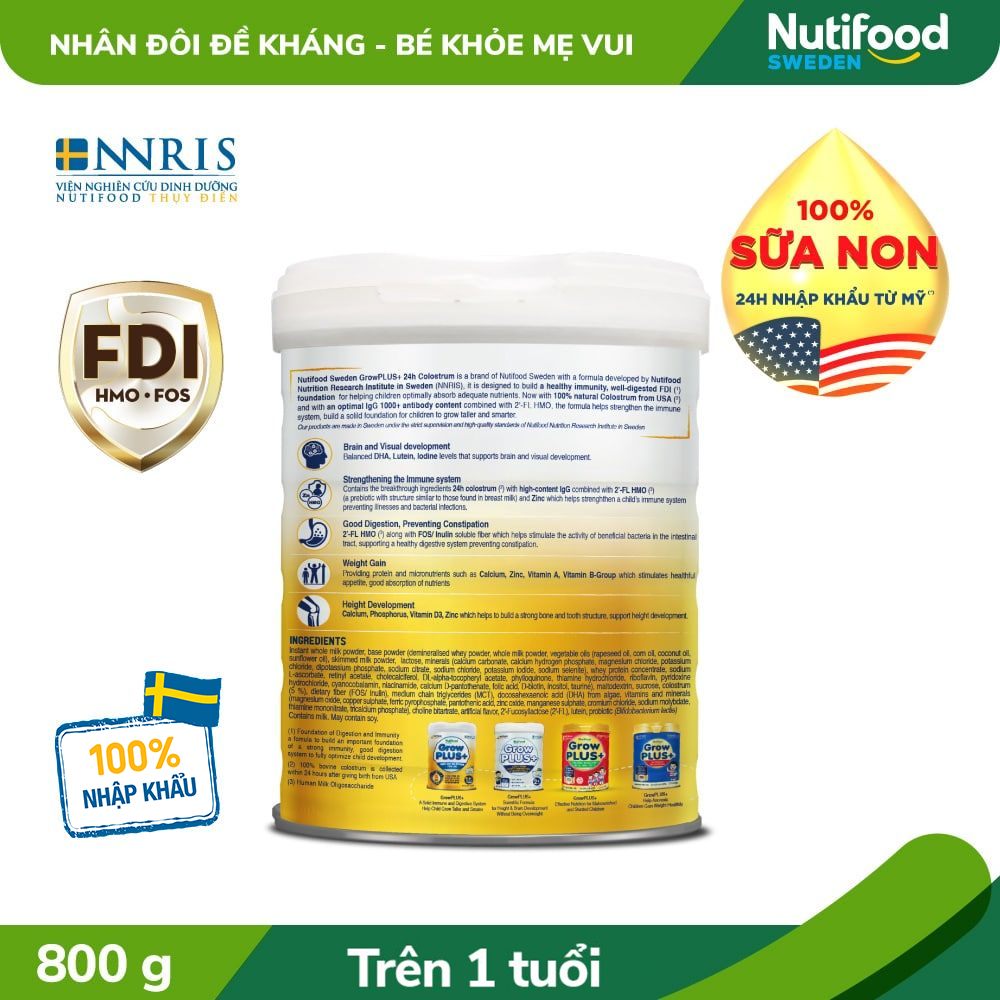 Bột sữa (bột whey khử khoáng, sữa bột nguyên kem, dầu thực vật (dầu hạt cải, dầu bắp, dầu dừa, dầu hướng dương), lactose, chất khoáng (calci carbonat, calci hydro phosphat, magnesi chlorid, kali clorid, dikali phosphat, kali citrat, natri citrat, natri clorid, kali iodid, natri selenit), đạm whey cô đặc, natri L-ascorbat, retinyl acetat, cholecalciferol, DL-alpha-tocopheryl acetat, phylloquinon, thiamin hydroclorid, riboflavin, pyridoxin hydroclorid, cyanocobalamin, niacinamid, calci D-pantothenat, acid folic, D-biotin, inositol, taurin), sữa non/ colostrum (5 %), chất xơ thực phẩm (FOS), vitamin và khoáng chất (dinatri phosphat, magnesi oxyd, sắt pyrophosphat, kẽm sulfat, magan sulfat, đồng sulfat, kali iodid, thiamin mononitrat, L-carnitin tartrat), 2'-Fucosyllactose (2'-FL), acid docosahexaenoic (DHA) từ dầu cá, acid arachidonic (ARA), lutein, probiotic (Bifidobacterium lactis)