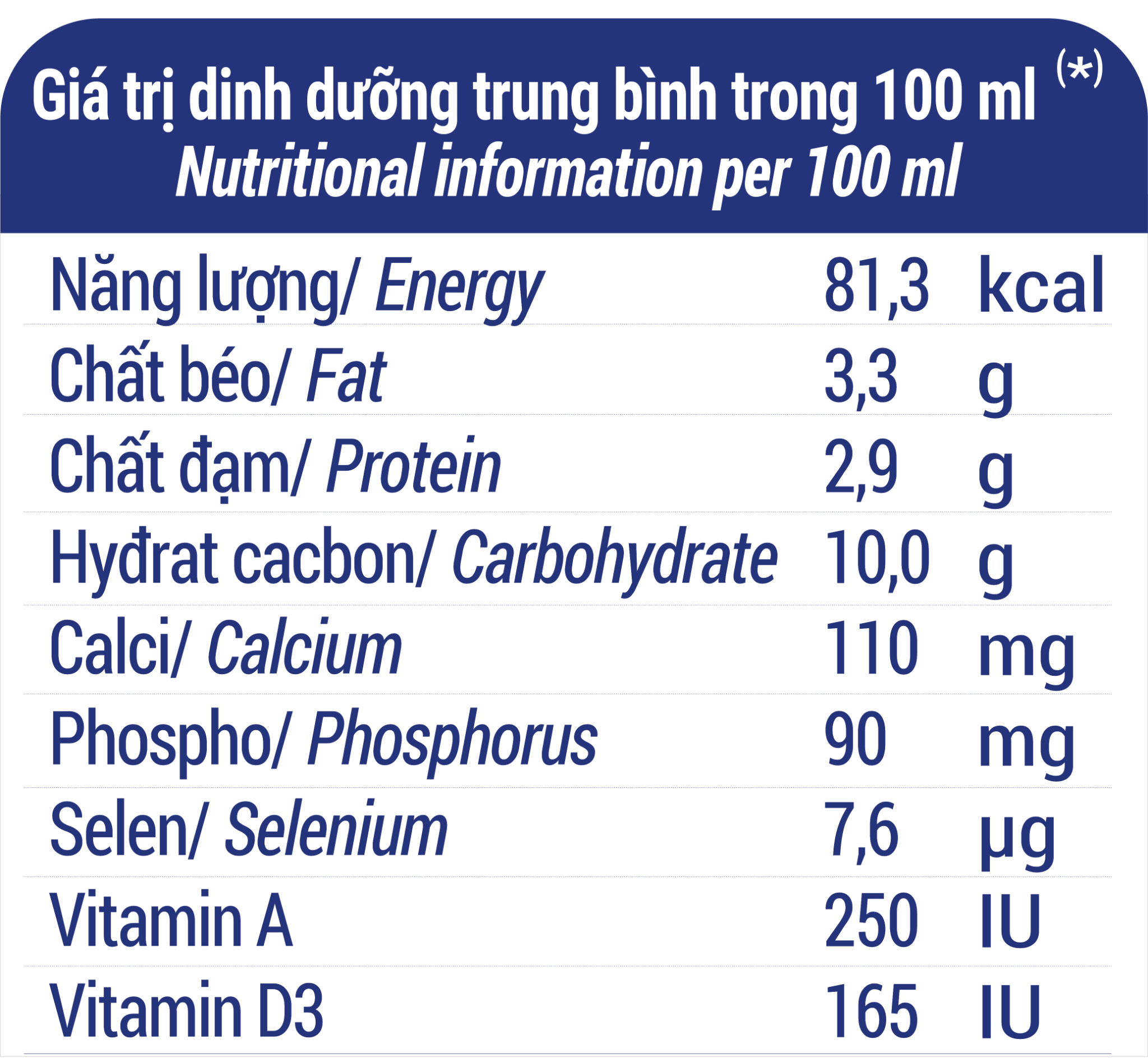 Sữa tươi (97%), đường (2,8%), chất ổn định (471, 460(i), 407, 466), vitamin (natri ascorbat, A, D3), khoáng chất (natri selenit)