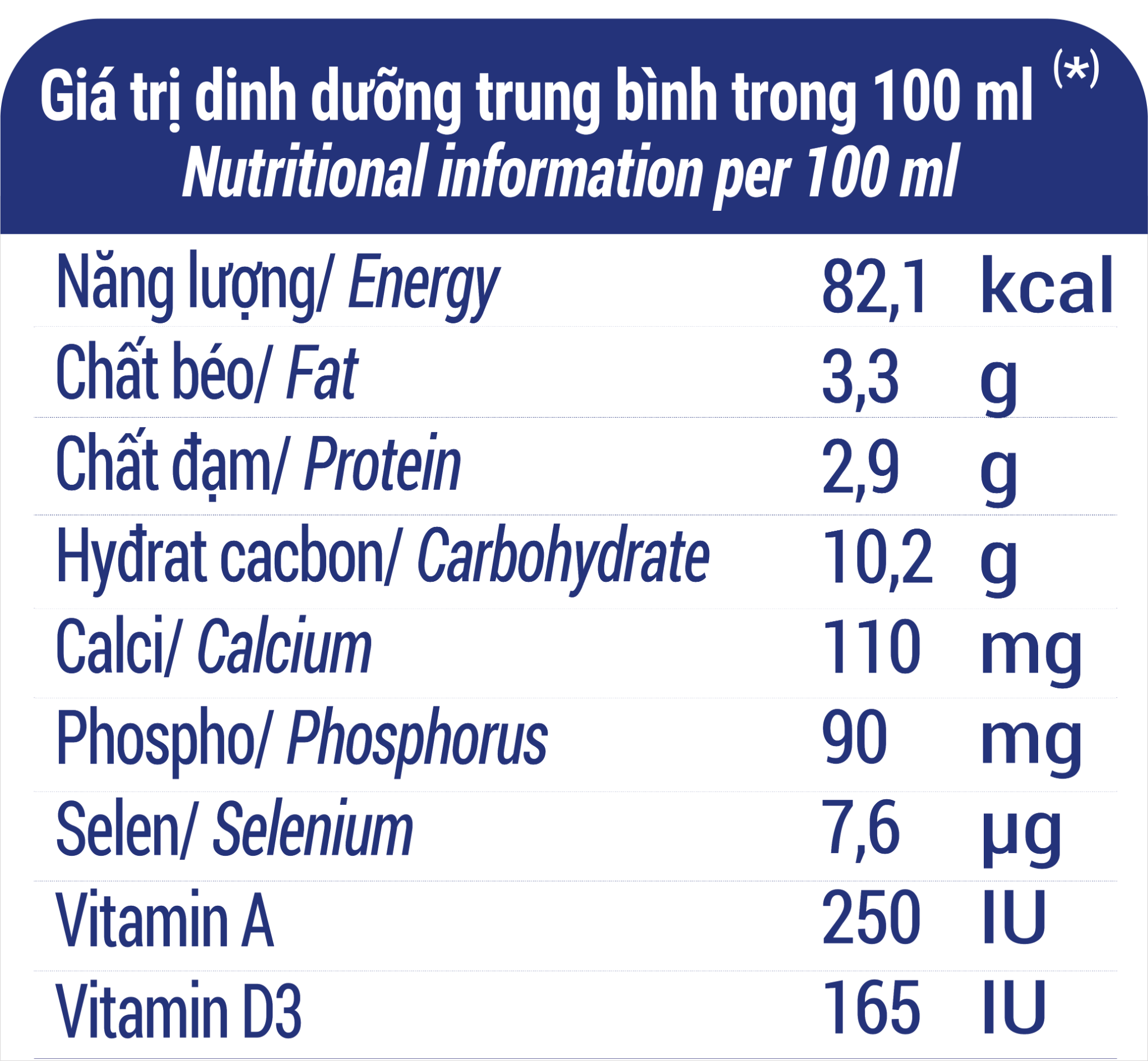 Sữa tươi (97%), đường (2,8%), chất ổn định (471, 460(i), 407, 466), vitamin (natri ascorbat, A, D3), khoáng chất (natri selenit)